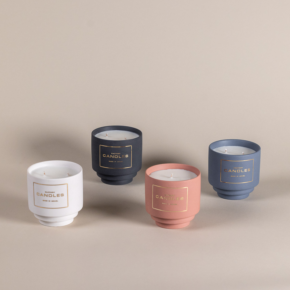 נר ריחני בכוס חרס צבעונית ישרה על רגל בעיצוב ומראה נקי.