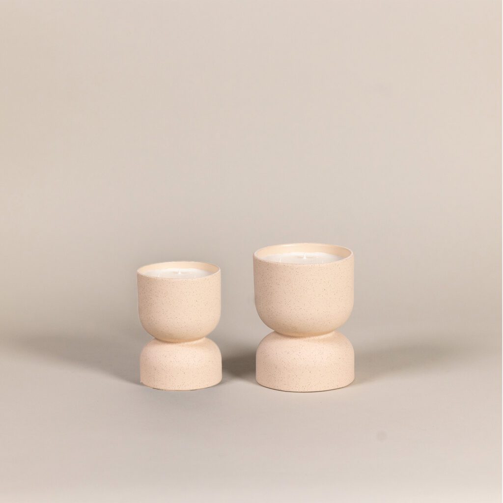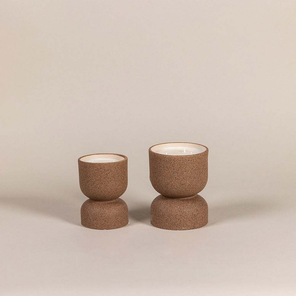 נר דמוי אבן מדברית במרקם מחוספס ועיצוב אלגנטי של שעון חול.